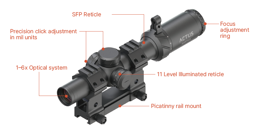 The ACTUS™ ARKS16 (1–6X24mm SFP) is designed and built to meet the needs of professional users in a variety of environments based on durability and precision. It will give you accurate shots at the moment that matters most. Riflescope features a Second focal plane (SFP) optical design that allows for fast and accurate target coverage at various magnifications, and illuminated reticles allow smooth targeting at low altitude at dawn or at dusk. The ACTUS riflescope will be the best sight to meet the needs of users in various operational environments.